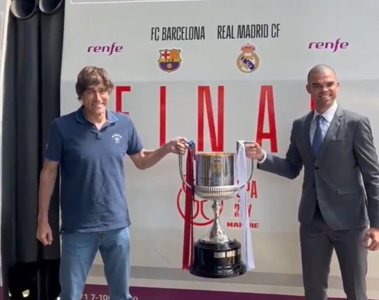 国家德比一触即发国王杯奖杯抵达皇萨名宿佩佩&萨利纳斯护送
