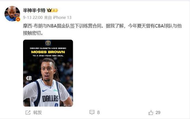 今年夏天广东队多名心仪的大外援被截胡,到目前为止广东队签下的3名外援中只有萨林杰1个内线球员,并且他还是被北控男篮放弃的。根据目前广东队的阵容预测,他们的第4名外援大概率还是内线外援;此前有多名体育博主爆料广东队有意NBA球员摩西-布朗,不过就在前天摩西-布朗和NBA掘金队签下了1份训练营的合同,从而完成了对广东队的“截胡”。不过训练营合同并不稳固,如果接下来的2个月内再被裁掉,广东队还是有可能得到他的。