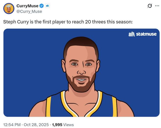 即便如此,凭借开季至今火热投射表现,库里成为本赛季首位命中20记三分球员,三分命中数高居联盟第一。