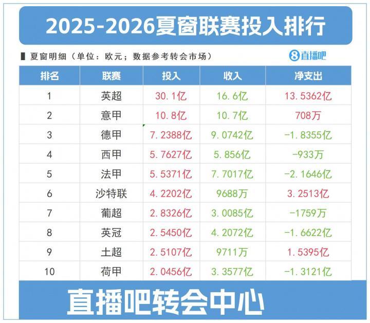 关窗倒计时2天!英超投入30亿欧独一档意甲+德甲+西甲+法甲