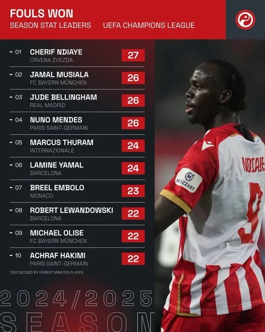 本赛季欧冠造犯规数:穆西亚拉、贝林厄姆、门德斯26次第二