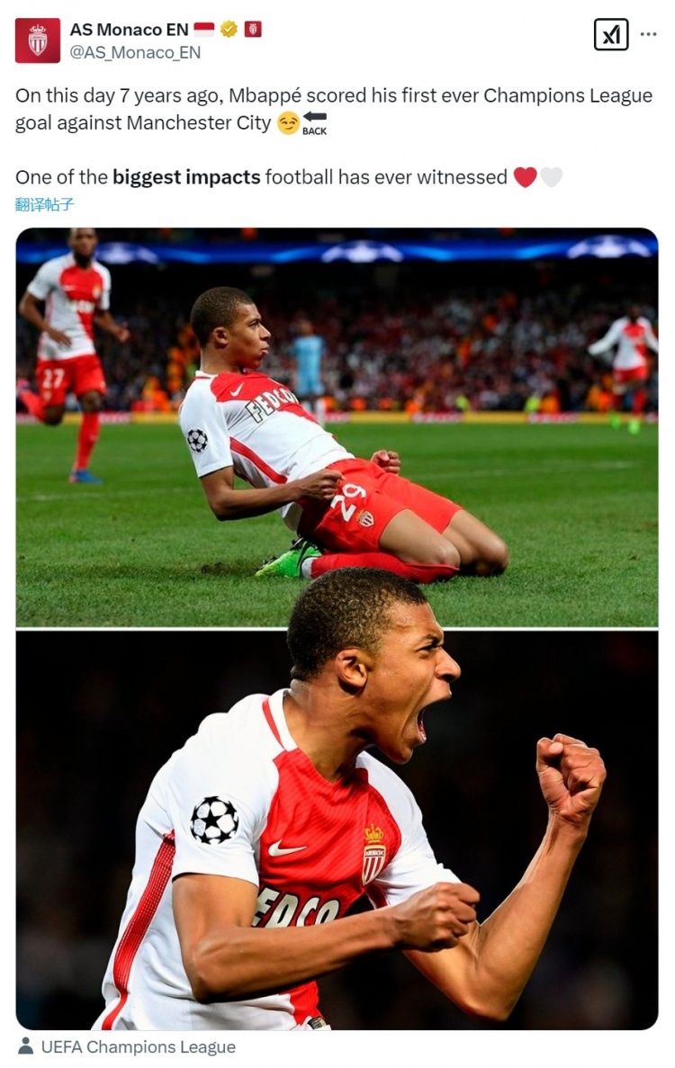 姆巴佩八年前的今天攻入欧冠处子球,对手也是曼城
