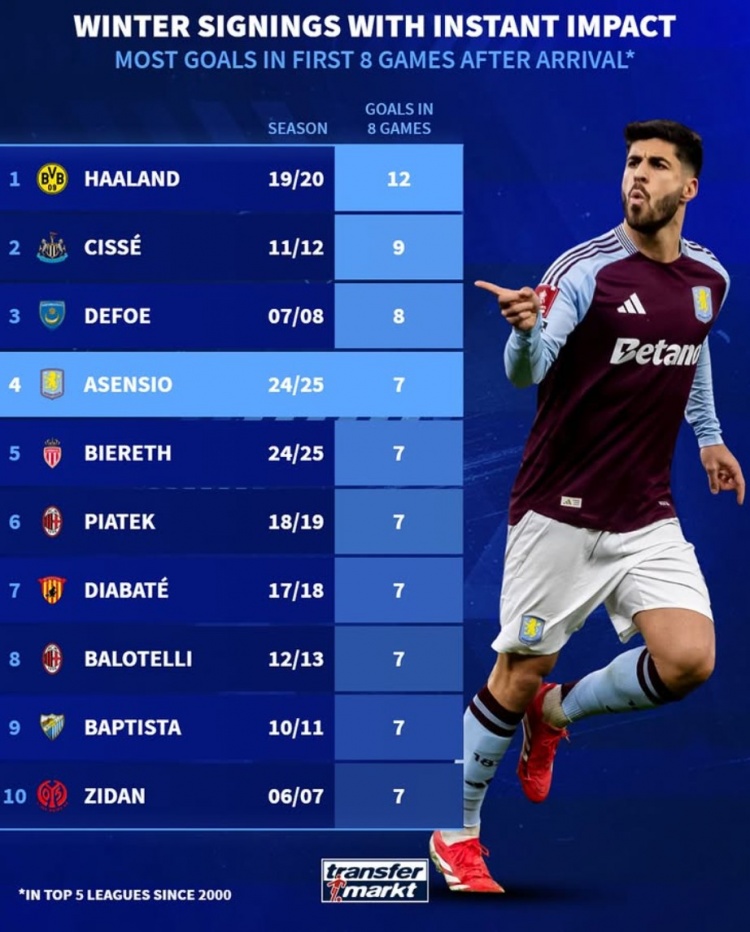 新世纪五大联赛冬窗新援前8场:哈兰德12球阿森西奥&皮亚特克7球