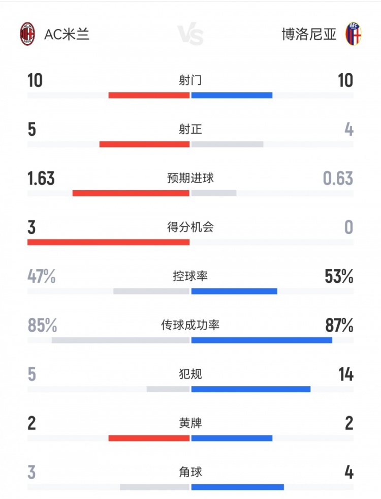 米兰31博洛尼亚数据:射门1010,射正54,得分机会30