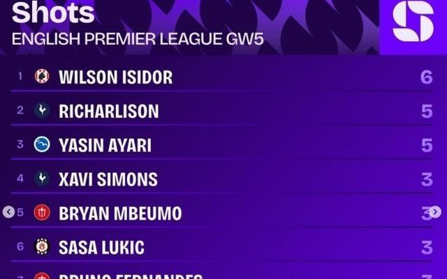 英超第5轮射门榜:伊西多6次居首,理查利森、亚辛阿亚里5次第二