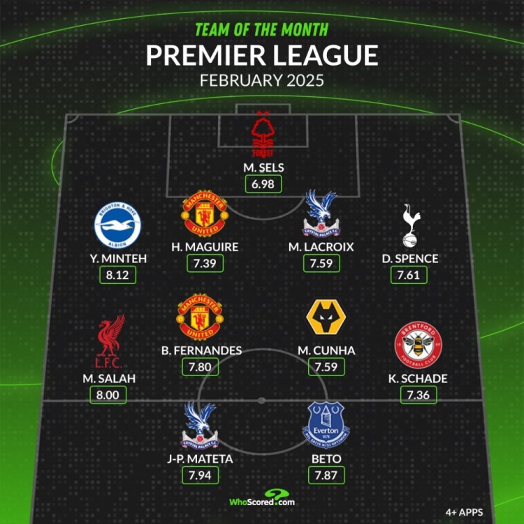 whoscored英超2月最佳阵:萨拉赫、B费领衔,马奎尔、库尼亚在列