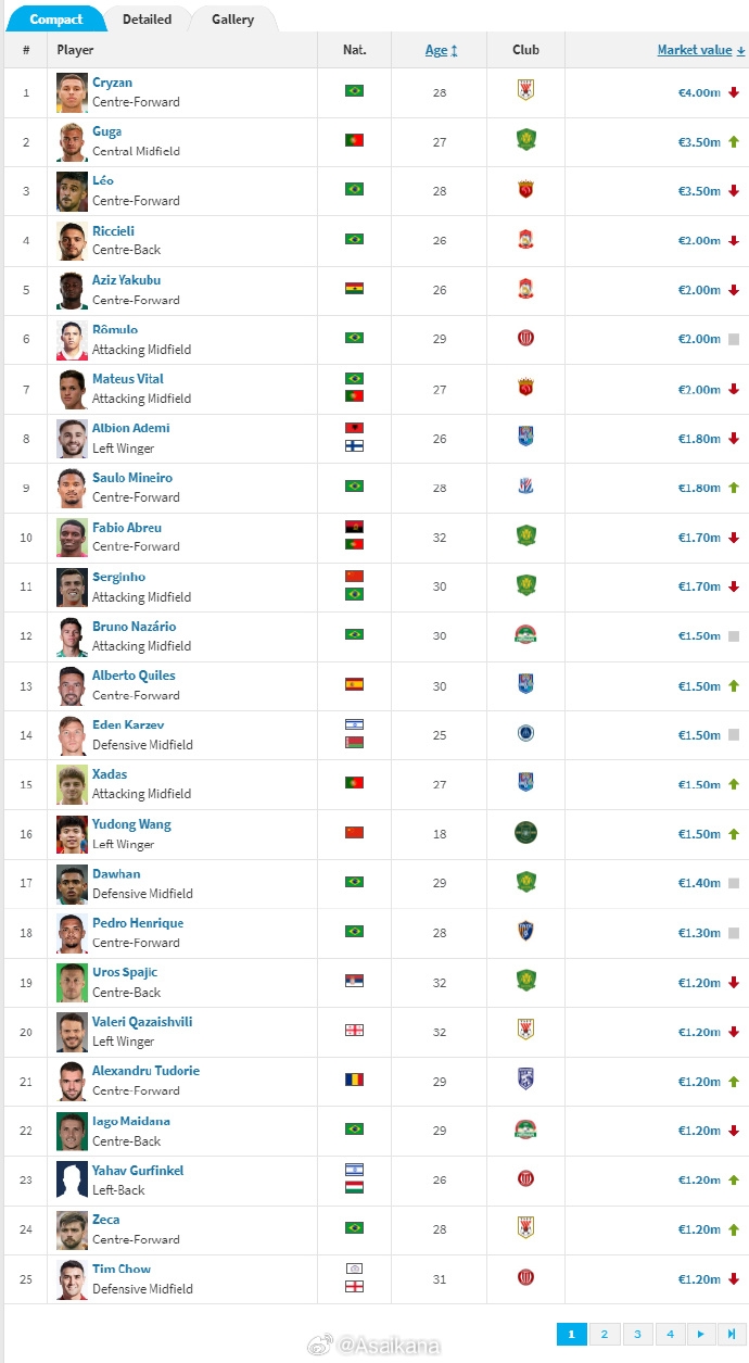 克雷桑身价下降到400万欧元,但仍然高居中超身价榜首位