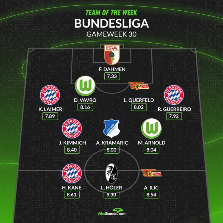 Whoscored评本轮德甲最佳阵:凯恩&霍勒领衔锋线,基米希在列