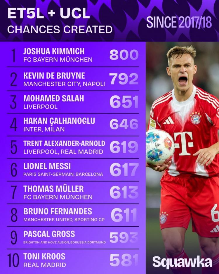 近9年五大联赛+欧冠创造机会榜:基米希压德布劳内居首梅西第6