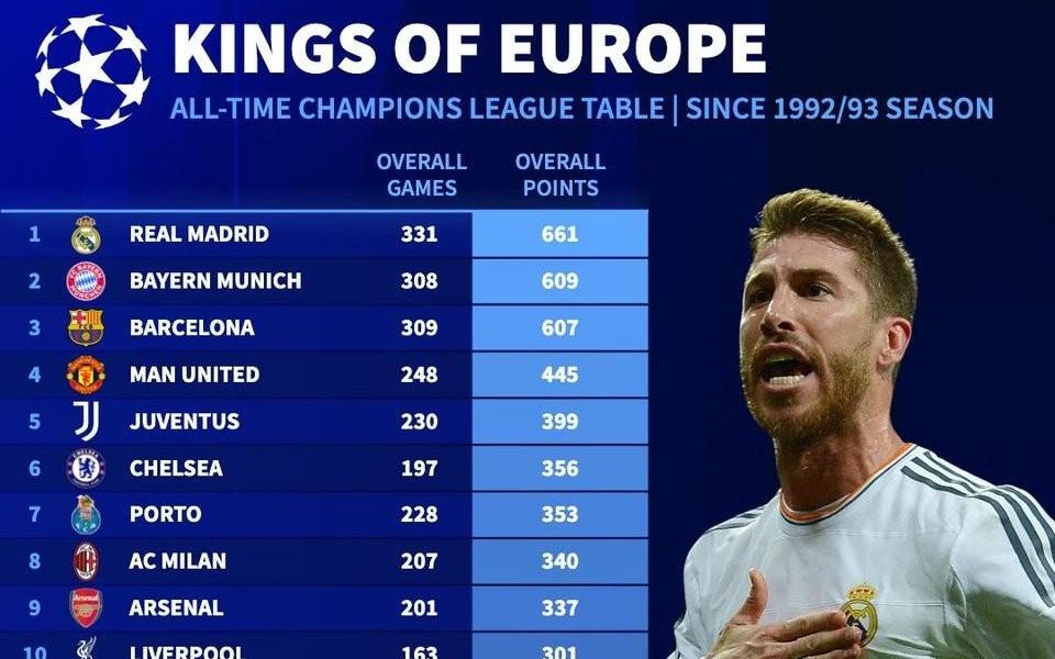 德转列欧冠历史总积分榜:皇马661分领跑,拜仁609分位列次席