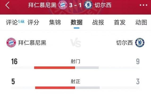 拜仁vs切尔西数据:射门169、得分机会41、预期进球2.070.52