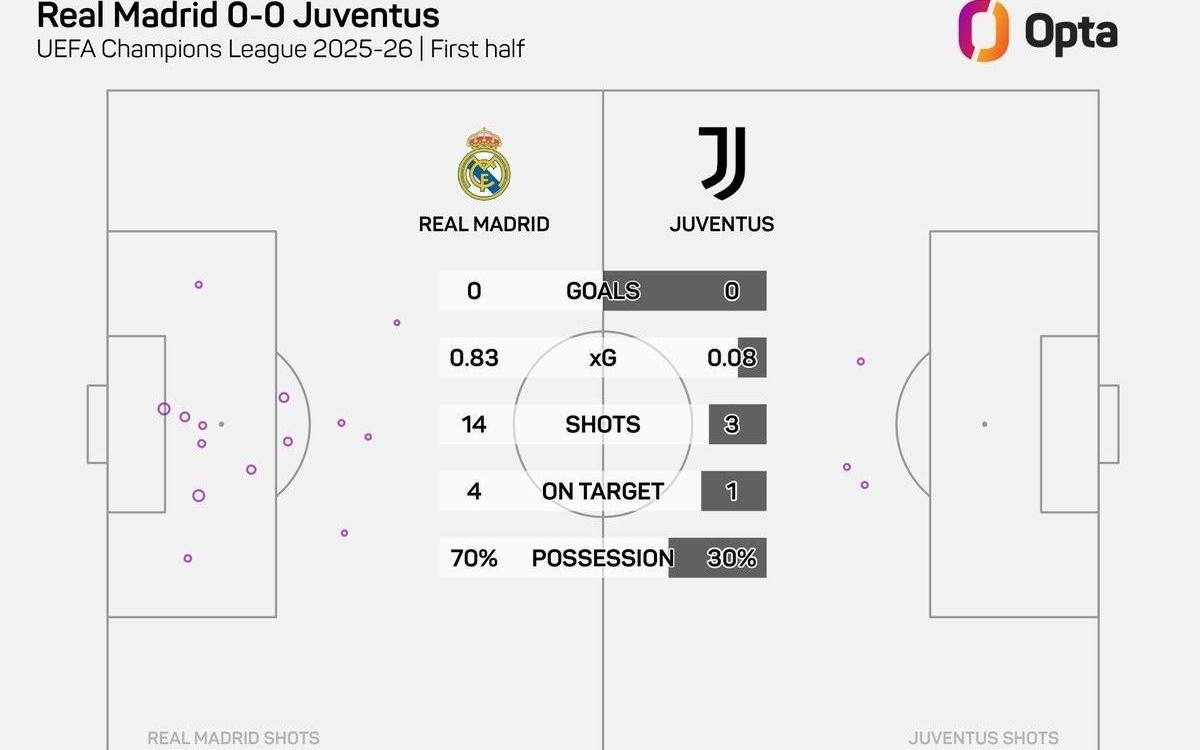 战尤文14次射门,为皇马本赛季没进球上半场中射门最多的