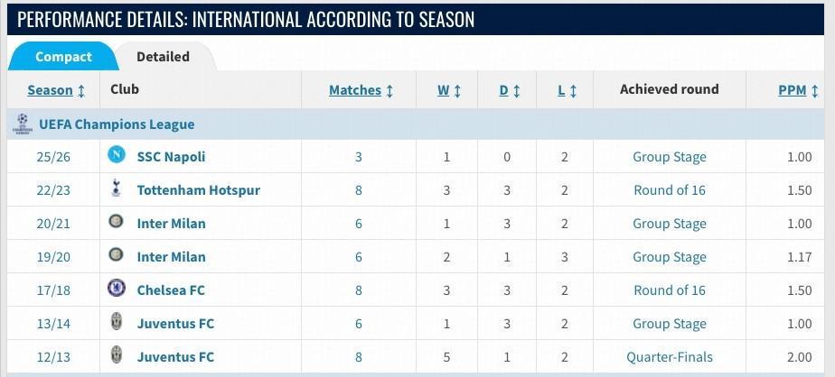 孔蒂欧冠带队战绩:45场16胜14平15负,胜率35.6%