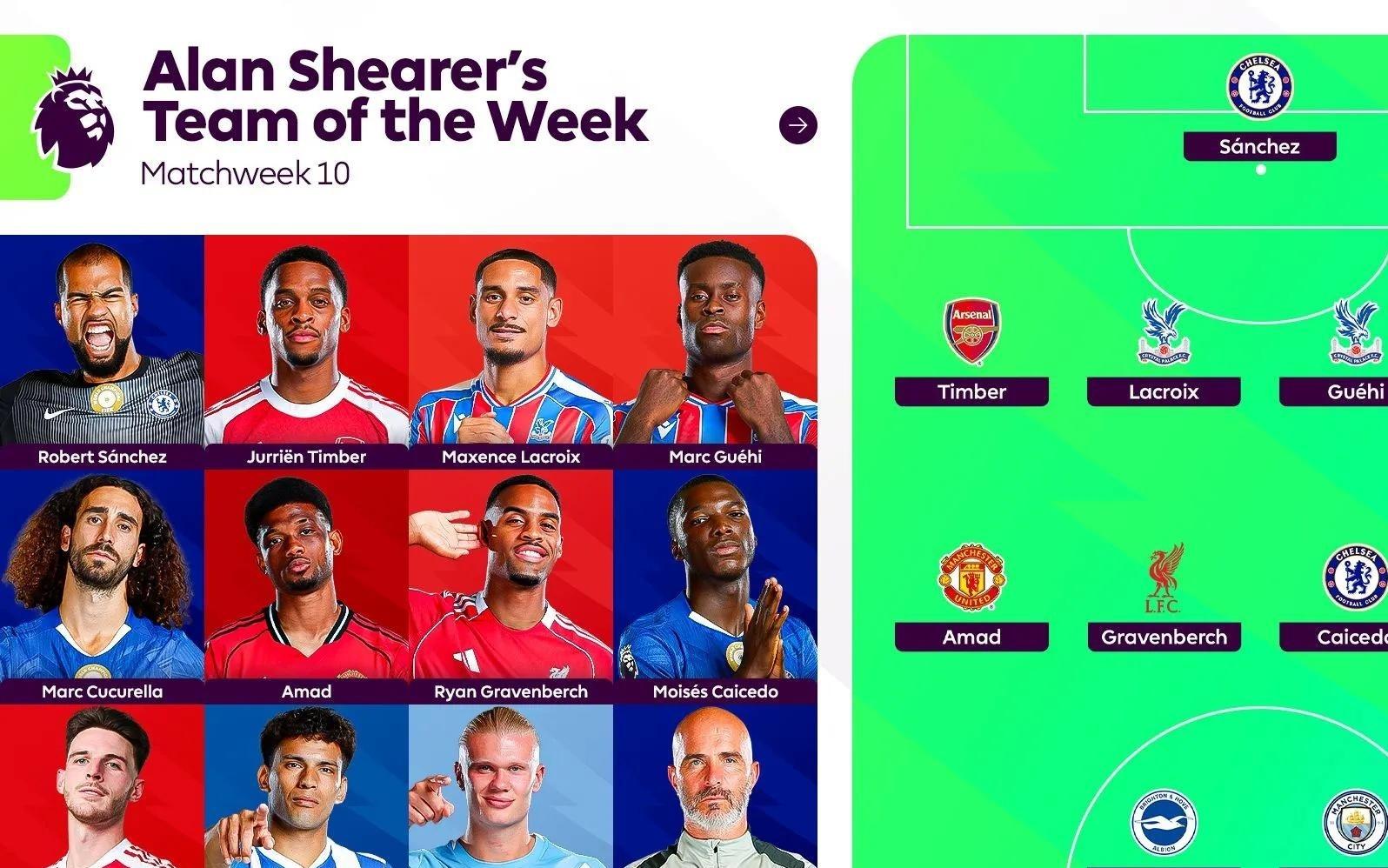 希勒评英超第10轮最佳阵:哈兰德、切尔西3人、阿森纳2人在列