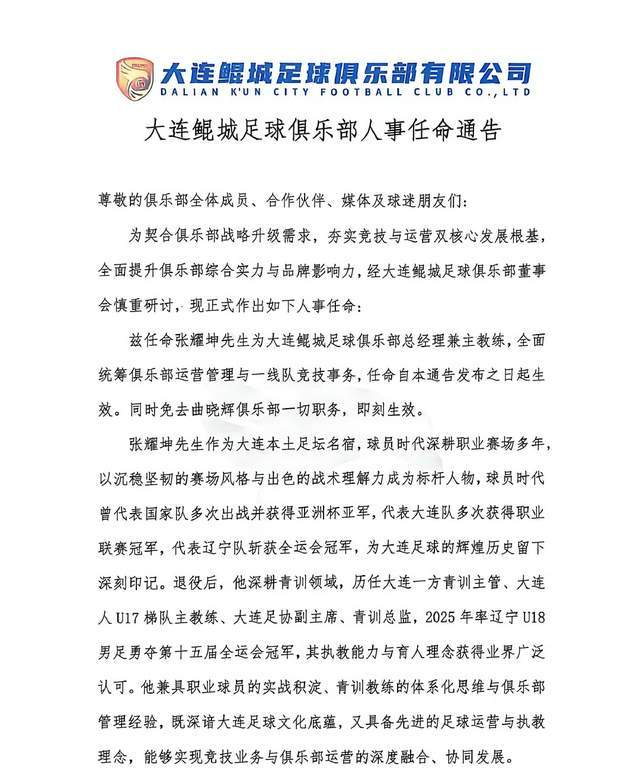 大连鲲城上个赛季作为升班马,最终排名第8,中甲球队想要冲超其实并不难,选好三名外援,按照发工资,成绩不会差。这是张耀坤首次担任职业联赛主教练,接手鲲城若能和大奎联手冲超,将会成为一段佳话。张耀坤退役之后,大部分时间都在青训领域深耕,此次走向职业联赛并且担任总经理,说明了球队对他的信任和鲲城换个活法的决心。